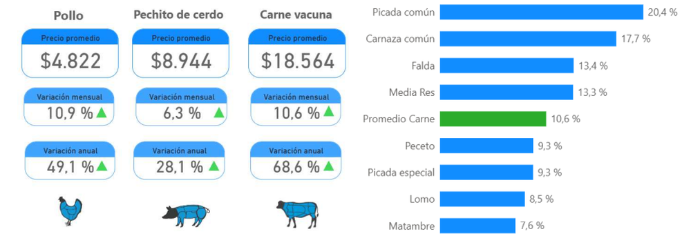 Asimismo, el precio del pollo fresco registró un incremento del 10,9% mensual y del 49,1% interanual, mientras que el valor del pechito de cerdo tuvo una variación positiva del 6,3% comparado con febrero y del 28,1% respecto al mismo mes del año anterior.