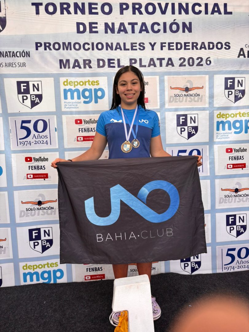 La nadadora Carmela Ruiz Acosta, representante de Uno Bahía Club, tuvo una actuación sobresaliente en el Campeonato Provincial de Natación FENBAS, desarrollado entre el 9 y el 12 de abril en Mar del Plata, en el natatorio “Alberto Zorrilla” del EMDER, donde se destacó en la categoría Cadete (14 y 15 años) y también logró subirse al podio en la categoría absoluta.