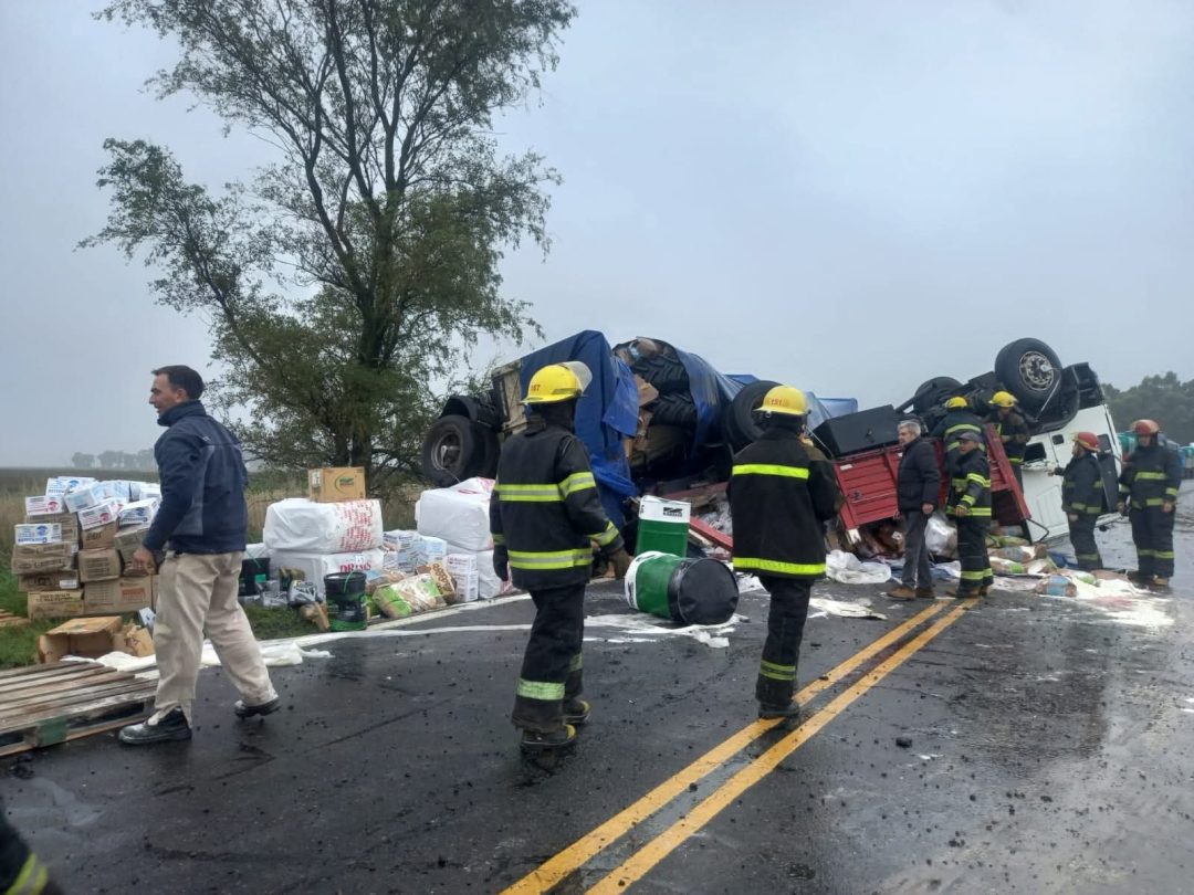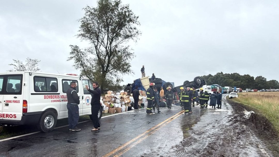 El siniestro ocurrió a unos 12 kilómetros de Coronel Pringles, en dirección a Olavarría. El vehículo y su carga quedaron obstruyendo la calzada por completo. Afortunadamente, no se registraron heridos. Trabajan Bomberos y Policía Comunal