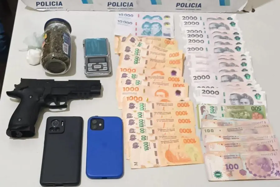 El procedimiento se llevó a cabo a las 21:30 hs, cuando el personal policial detectó a dos sujetos dentro de un Peugeot 206 rojo, patente MBU-838. Al ser identificados como Agustín Ezequiel Jara (21) y Juan Cruz Sarlangue (20), los uniformados realizaron una requisa en la que hallaron una pistola de aire comprimido calibre 4.5, réplica de una 9 mm., dos teléfonos celulares, una balanza de precisión, $69.000 en efectivo, un envoltorio con cocaína y un frasco con marihuana (se ampliará con el pesaje oficial).