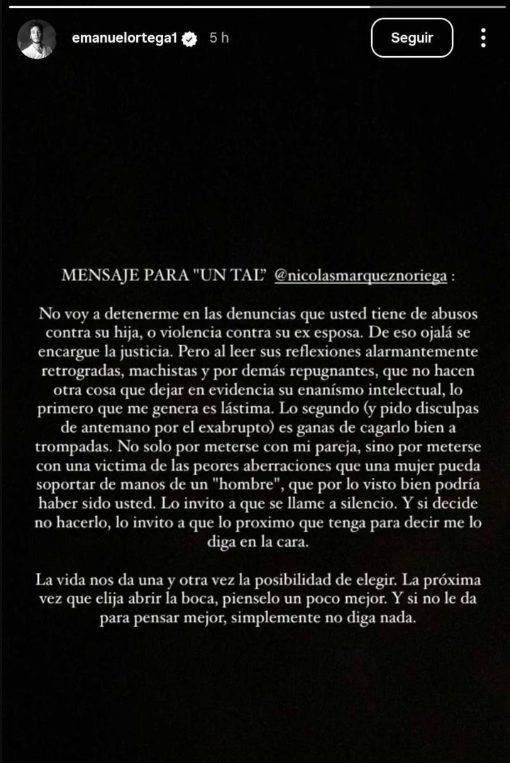 “Mensaje para un tal Nicolás Márquez Noriega”, empieza el escrito que Emanuel subió a su cuenta. “Al leer sus reflexiones alarmantemente retrógradas, machistas, y por demás repugnantes, que no hacen otra cosa que dejar en evidencia su enanismo intelectual, lo primero que me genera es lástima”, lanzó.