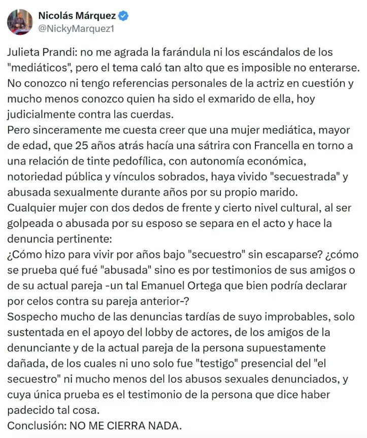 “Cualquier mujer con dos dedos de frente y cierto nivel cultural, al ser golpeada o abusada por su esposo, se separa en el acto y hace la denuncia pertinente”, continúa la publicación de Márquez. Y sumó: “¿Cómo se prueba que fue ‘abusada’ si no es por testimonios de sus amigos o de su actual pareja -un tal Emanuel Ortega que bien podría declarar en contra por celos de su pareja anterior-?”.