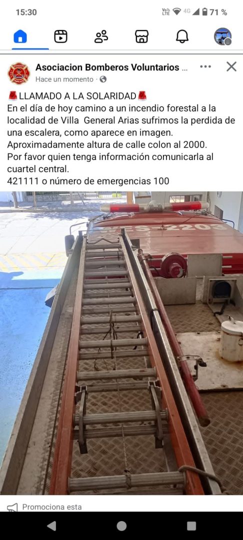 La asociación Bomberos Voluntarios de Punta Alta acaban de hacer un llamado a la solidaridad ante la perdida de la escalera que llevan sobre una de las autobombas, y quien la tenga o conozca circunstancias del hecho, la devuelva a la institución
