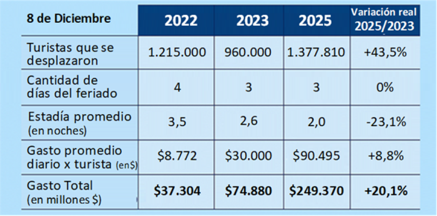 De acuerdo con el relevamiento de la Confederación Argentina de la Mediana Empresa (CAME), durante el fin de semana largo por el Día de la Inmaculada Concepción se desplazaron 1.377.810 turistas por la Argentina, un 43,5% más que en el mismo feriado de 2023 (en 2024 no hubo feriado). La fecha volvió a consolidarse como uno de los momentos de movilidad turística previos al verano.