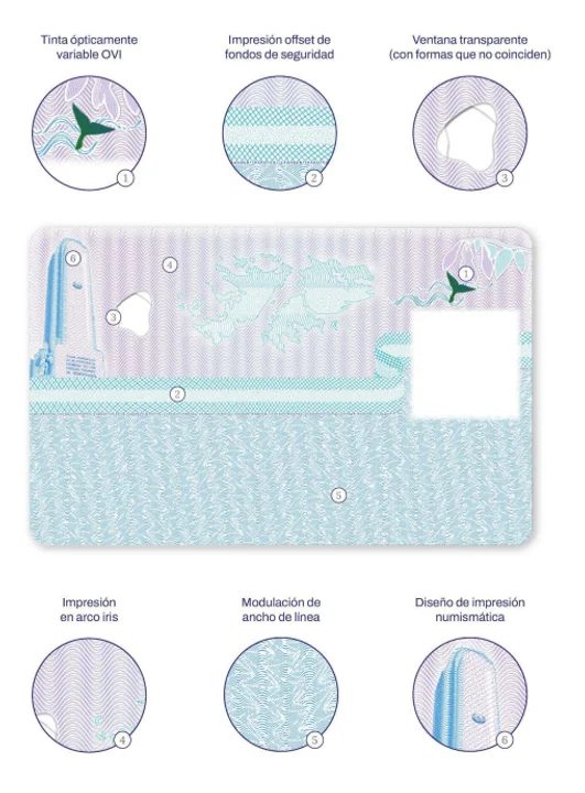 El fondo de la página tiene guilloches perdidos y espejados, impresos a DOS (2) colores, una representación estilizada del globo terráqueo con tramas que diferencian la silueta de la República Argentina, el símbolo internacional de documentos de viaje, una imagen MIRAGE y una ventana transparente.