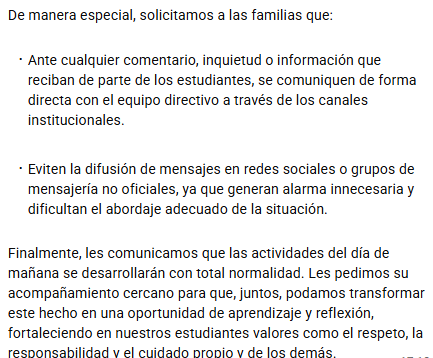 El dictado de clases no se interrumpió, y la institución envió recomendaciones de como abordar el tema