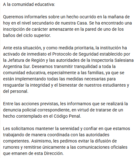 Ante la situación, las autoridades del establecimiento emitieron un comunicado oficial en el que informaron la activación inmediata del Protocolo de Seguridad dispuesto por la Jefatura de Región y la Inspectoría Salesiana Argentina Sur. Asimismo, indicaron que se realizará la denuncia correspondiente
