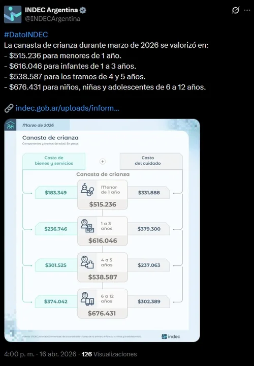 A su vez, el informe oficial, en sus detalles, marca que la canasta de crianza contempla dos componentes principales: el costo de los bienes y servicios necesarios para el desarrollo de los niños y el valor económico del tiempo destinado a su cuidado.